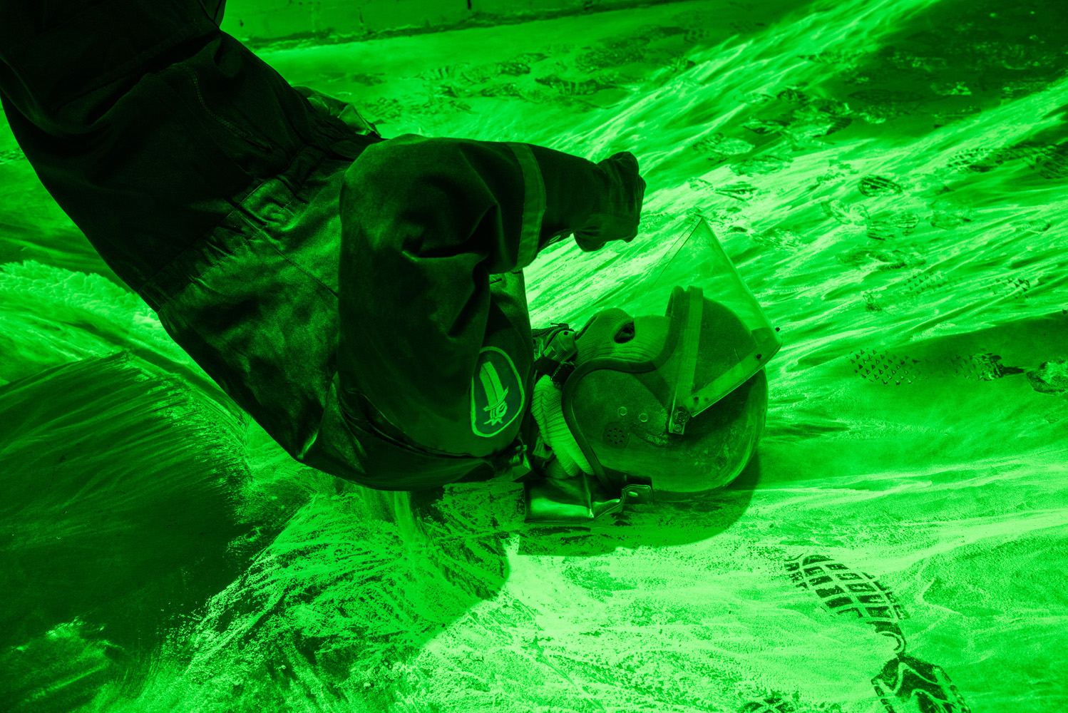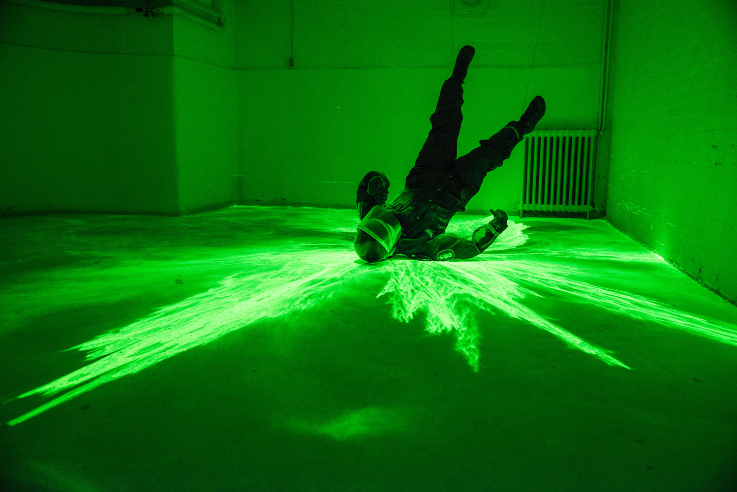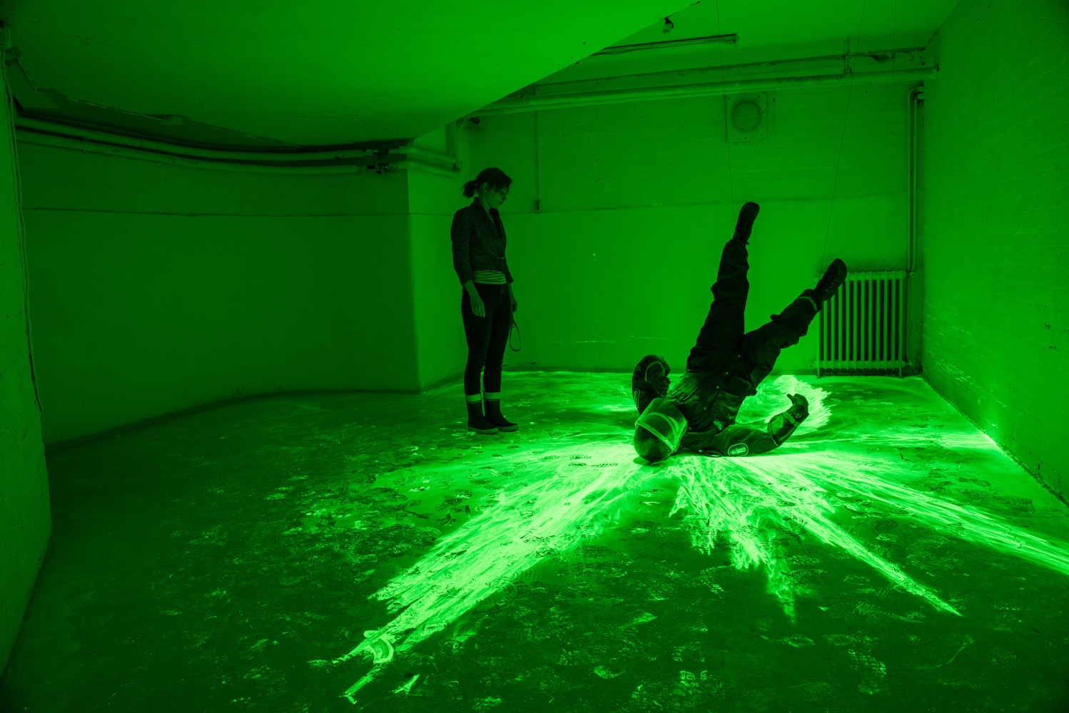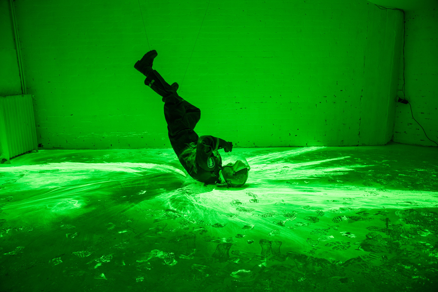 Disperse Light absorbing/emitting pigment, motion detector, flash lights, clothing, helmet, steel. Life size. 2014