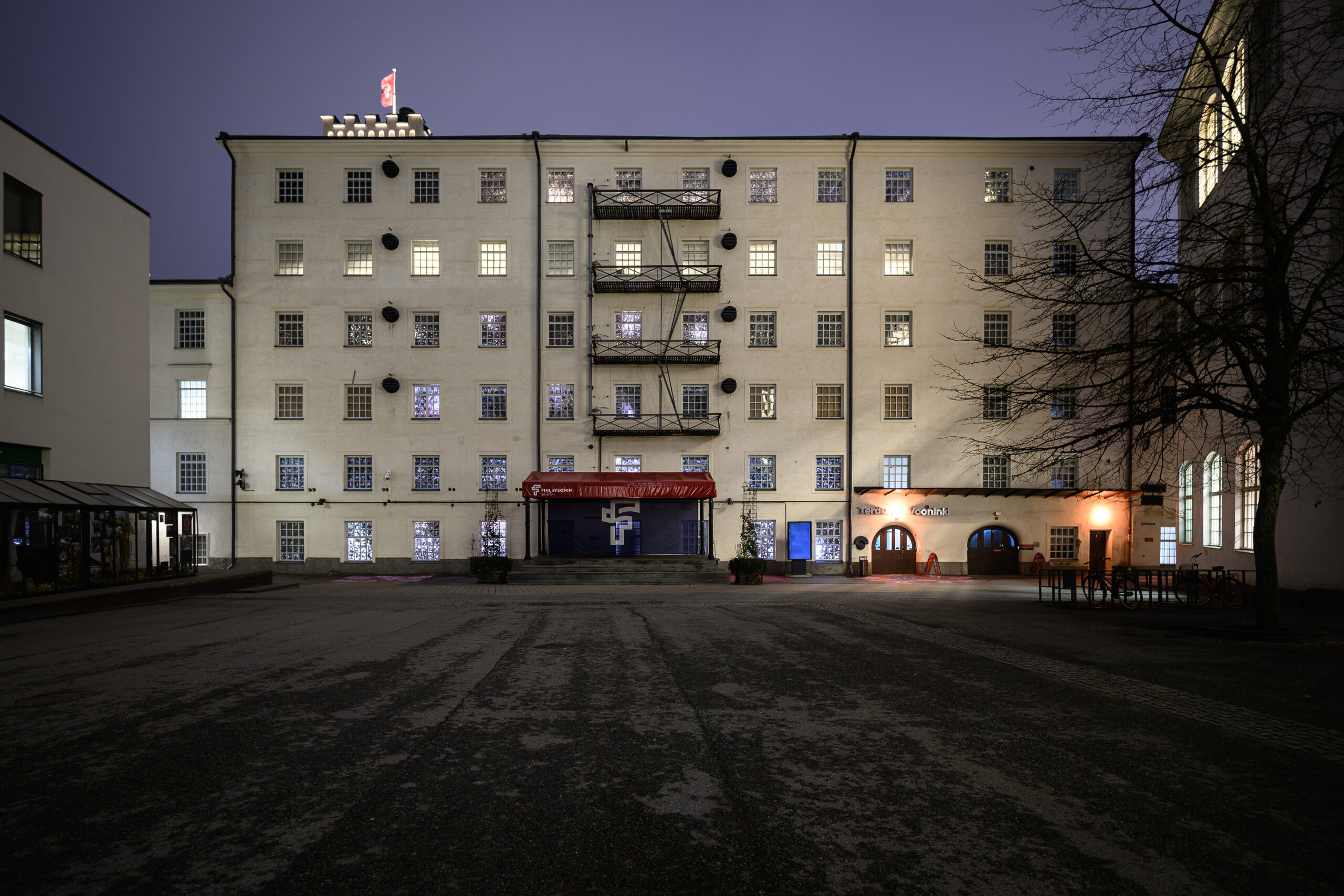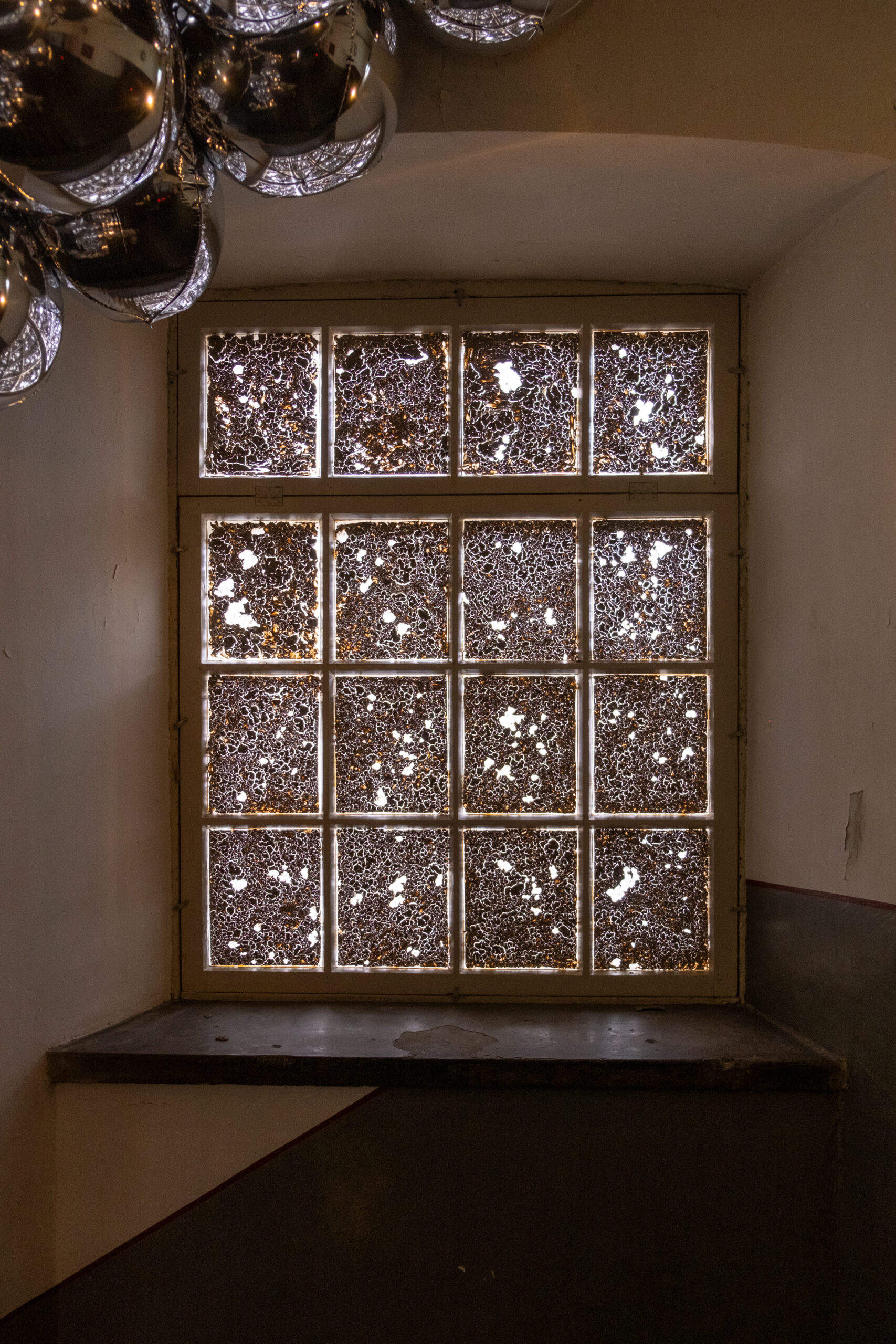 The work is installed in the windows of the Finlayson factory building. Over time, the raw clay crumbles down from the windows, allowing daylight to enter; on dark evenings, timed moving lights can be seen shimmering through cracks in the clay from the outside.